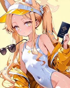 O,seia\(blue_archive\), 1girl, animal ears, swimsuit, solo, blonde hair, one-piece swimsuit, long hair, jacket, yellow background, visor cap, sunglasses, fox ears, looking at viewer, breasts, small breasts, tail, halo, white one-piece swimsuit, twintails, off shoulder, eyewear removed, holding, animal ear fluff, covered navel, simple background, fox tail, yellow jacket, holding eyewear, open clothes, bare shoulders, sidelocks, blush, standing, hair ornament, parted bangs, closed mouth, long sleeves, hood, yellow eyes, flower, bangs, thighs, hair flower, open jacket, extra ears, fox girl, from side, hooded jacket, highleg, sweat, collarbone, wet, cowboy shot, highleg swimsuit, leg up,(UHD),anatomically correct,accurate,textured skin,super detail,high details,award winning,best quality,high quality,retina,HD,16k,1080P,