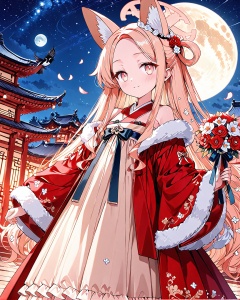 O,seia(blue_archive),Hanfu,moon,flowers,hair accessories,long hair,night,flowers,full moon,wide sleeves,blusher,ribbon,decoration,hair ring,platform,dress,night sky,headband,holding,fur trim,extremely long hair,galaxy,magpie,petal,bouquet,architecture,long sleeves,blooming,East Asian architecture,night sky,wide sleeves,closed mouth,happy,accurate,best quality,anatomically correct,red eyes,Nai3 style (Nai3:1.4),extremely detailed CG unified 8k wallpaper (high quality),very exquisite and beautiful,masterpiece,super fine CG unified 8k wallpaper,masterpiece,best quality,super fine,beautiful and delicate eyes:1.2,(UHD),anatomically correct,accurate,textured skin,super detail,high details,award winning,best quality,high quality,retina,HD,16k,1080P,