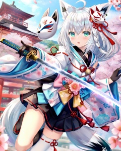 1girl, shirakami fubuki, weapon, animal ears, sword, mask, holding weapon, virtual youtuber, fox ears, solo, thighhighs, gloves, holding, holding sword, fox girl, tail, white hair, long hair, black gloves, ahoge, bangs, looking at viewer, cherry blossoms, fox tail, hair between eyes, green eyes, skirt, katana, fox mask, black skirt, animal ear fluff, braid, japanese clothes, mask on head, petals, flower, sidelocks, kimono, outdoors, floral print, architecture, jewelry, black thighhighs, single braid, wide sleeves, sash, east asian architecture, single thighhigh, white thighhighs, bell, :o, open mouth, obi, pleated skirt, zettai ryouiki, pink flower, ribbon, leg up, ribbon trim, pentagram, blush
