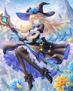 witch hat, blue flower, 1girl, gloves, dress, hat, flower, closed eyes, long hair, black dress, short sleeves, blonde hair, solo, puffy sleeves, high heels, puffy short sleeves, pantyhose, holding, sky, black headwear, black gloves, witch, cloud, bangs, frills, bow, skull, black footwear, very long hair, multicolored hair, blue bow, blue hair, frilled dress, black pantyhose, staff, closed mouth, petals, full body, smile, yellow flower, crystal, jewelry, floating, blue rose, gem, holding staff, outdoors, shoes, ribbon, cloudy sky, blue ribbon, hat bow, hair between eyes, gradient hair, breasts, hat flower, blue bowtie