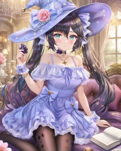 mona (genshin impact), multiple girls, hat, 2girls, dress, fischl (genshin impact), witch hat, long hair, book, twintails, purple dress, blonde hair, looking at viewer, pantyhose, candle, food, jewelry, flower, black hair, frilled dress, bangs, off-shoulder dress, frills, sitting, breasts, green eyes, purple headwear, indoors, hat flower, off shoulder, bare shoulders, hair ornament, holding, hat ornament, sparkle print, couch, blush, hand on headwear, fruit, star (symbol), alternate costume, blue eyes, hair between eyes, choker, very long hair, closed mouth, collarbone, holding book, earrings, bracelet, necklace, black pantyhose, hair ribbon, ribbon, medium breasts, short sleeves, chandelier, candlestand, blue headwear, crescent, blue dress, on couch, underwear, arm support, pink flower, book stack, window, two side up, bow, arm up, wrist cuffs, aqua eyes, open book, hand up, star earrings, grapes, holding food
