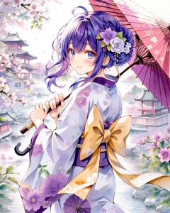 1girl, umbrella, solo, flower, japanese clothes, kimono, smile, looking at viewer, blue eyes, holding umbrella, hair ornament, holding, hair flower, oil-paper umbrella, blush, floral print, sash, purple hair, obi, bangs, closed mouth, looking back, print kimono, long sleeves, traditional media, wide sleeves, hair bun, single hair bun, blue hair, purple kimono, white flower, back bow, short hair, multicolored hair, standing, bow, hair between eyes, outdoors, nail polish, purple flower, braid, purple nails, leaf, sidelocks, fingernails, cowboy shot, pink nails, from side, looking to the side, from behind, ahoge, white kimono, purple umbrella, parasol, yellow bow, red flower