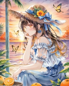 1girl, solo, hat, flower, earrings, long hair, jewelry, traditional media, fruit, short sleeves, bug, yellow flower, butterfly, leaf, painting (medium), straw hat, shirt, skirt, watercolor (medium), food, hat flower, sunset, outdoors, lemon, blue skirt, tree, bangs, ribbon, black hair, brown hair, frills, puffy sleeves, lemon slice, blue ribbon, sitting, hand up, off shoulder, profile, red flower, puffy short sleeves, blush, hat ribbon, sun hat, sky, signature, palm tree, multicolored hair, yellow butterfly, off-shoulder shirt, see-through, head rest, from side, bare shoulders, evening, water, dress, hand on own face, cloud, orange sky, brown headwear, grey shirt, gradient hair, palm leaf, closed mouth, plant, sunlight, brown eyes, orange eyes, nail polish, orange flower, orange (fruit), frilled shirt, see-through sleeves, bow, blue bow, yellow eyes, multicolored eyes