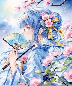 1girl, solo, traditional media, hair ornament, flower, painting (medium), hand fan, hair flower, long hair, watercolor (medium), holding fan, holding, long sleeves, paper fan, bangs, chinese clothes, upper body, blue hair, hanfu, uchiwa, blue eyes, leaf, pink flower, eyelashes, tassel, profile, from side, bow, ribbon, jewelry, blush, wide sleeves, looking away, hair rings, closed mouth, night, sleeves past wrists, aqua eyes, hagoromo, hair ribbon, hair bun, hands up, dress, sky, light particles, bowtie, looking up, plant, yellow ribbon, nail polish, beads, shawl, branch, blue background, blue nails