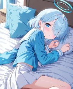 arona (blue archive),1girl,halo,arona (blue archive),blue eyes,blue hair,solo,hair over one eye,skirt,school uniform,short hair,on side,lying,white skirt,blush,looking at viewer,pillow,bed,serafuku,sailor collar,long sleeves,blue shirt,on bed,pleated skirt,shirt,white sailor collar,bed sheet,bangs,