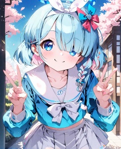 arona (blue archive),1girl,arona (blue archive),solo,skirt,v,double v,white skirt,smile,blue eyes,shirt,hair over one eye,blue hair,pleated skirt,halo,school uniform,bow,braid,long sleeves,white choker,sailor collar,cherry blossoms,white sailor collar,outdoors,white hairband,hairband,looking at viewer,pink hair,choker,blue shirt,white bow,bangs,multicolored hair,short hair,day,closed mouth,serafuku,cowboy shot,bowtie,petals,tree,collarbone,bow hairband,single braid,ribbon,blush,hair ribbon,white ribbon,eyes visible through hair,standing,two-tone hair,