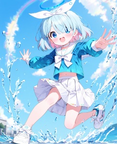 arona (blue archive),1girl, arona (blue archive), skirt, solo, white skirt, shoes, blue hair, hair over one eye, halo, water, white footwear, sneakers, smile, shirt, school uniform, sailor collar, blue eyes, braid, bow, hairband, blue shirt, multicolored hair, open mouth, choker, looking at viewer, white sailor collar, short hair, full body, long sleeves, serafuku, sky, pink hair, ribbon, blush, bangs, splashing, white choker, blue sky
