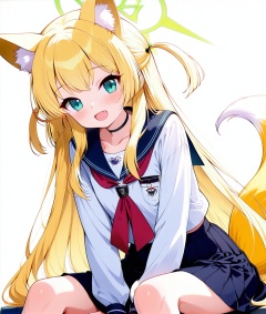 Kurumi(blue archive),O,Kurumi(blue archive),1girl, solo, animal ears, blonde hair, fox ears, skirt, school uniform, halo, fox tail, tail, looking at viewer, long hair, white background, fox girl, smile, neckerchief, simple background, serafuku, sailor collar, long sleeves, blush, pleated skirt, red neckerchief, choker, animal ear fluff, bangs, open mouth, two side up, blue skirt, :d, shirt, hand up, white shirt, fang, black choker, aqua eyes,(aesthetics ),masterpiece,best quality,ultra high definition,32K resolution,clear focus,delicate details,high-end texture,fashion photography,film perspective,rich colors,color palette,advertising style,tension composition,masterpiece,mild atmosphere,latest,dynamic Dutch perspective,transparent composition,magazine cover,cover,
