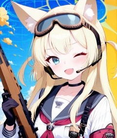 O,ultra detailed anime texture,Kurumi(blue archive),Kurumi(blue archive),1girl, animal ears, solo, weapon, one eye closed, gun, long hair, headset, holding weapon, blue eyes, gloves, fang, holding, goggles, animal ear fluff, upper body, holding gun, choker, goggles on head, red neckerchief, blonde hair, open mouth, black choker, sailor collar, neckerchief, rifle, black gloves, long sleeves, fox ears, bangs, shirt, armband,(aesthetics ),masterpiece,best quality,ultra high definition,32K resolution,clear focus,delicate details,high-end texture,fashion photography,film perspective,rich colors,color palette,advertising style,tension composition,masterpiece,mild atmosphere,latest,dynamic Dutch perspective,transparent composition,magazine cover,cover,
