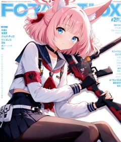 O,ultra detailed anime texture,Yazawa Nico(blue archive),Yazawa Nico(blue archive),1girl, solo, weapon, animal ears, skirt, gloves, blue eyes, fingerless gloves, gun, armband, school uniform, pantyhose, black gloves, pink hair, halo, red neckerchief, black pantyhose, neckerchief, looking at viewer, black skirt, sailor collar, serafuku, animal ear fluff, short hair, long sleeves, fox ears, simple background, closed mouth, bangs, lying, shirt, pleated skirt, white shirt, shotgun, on side, white background, choker,(aesthetics ),masterpiece,best quality,ultra high definition,32K resolution,clear focus,delicate details,high-end texture,fashion photography,film perspective,rich colors,color palette,advertising style,tension composition,masterpiece,mild atmosphere,latest,dynamic Dutch perspective,transparent composition,magazine cover,cover,