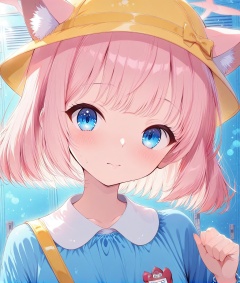 O,ultra detailed anime texture,Yazawa Nico(blue archive),Blue aura,Yazawa Nico(blue archive),1girl, animal ears, yellow headwear, solo, school hat, blue eyes, kindergarten uniform, pink hair, hat, blush, animal ear fluff, looking at viewer, short hair, name tag, upper body, blue shirt, locker, bangs, shirt, closed mouth, cat ears, ears through headwear, halo, bag,(UHD),ccurate,super detail,award winning,high quality,best quality,high details,textured skin,anatomically correct,retina,HD,16k,