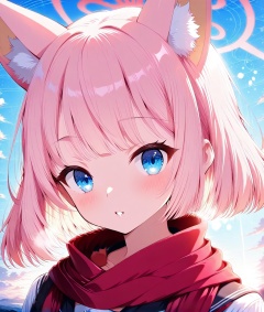 O,ultra detailed anime texture,Yazawa Nico(blue archive),Blue aura,Yazawa Nico(blue archive),1girl, solo, animal ears, pink hair, blue eyes, animal ear fluff, scarf, red scarf, parted lips, looking at viewer, blush, halo, short hair, sky, bangs, outdoors, cloud, sailor collar, day, black sailor collar, extra ears, blue sky, school uniform, upper body, fox ears, shirt, portrait, serafuku, white shirt,(UHD),ccurate,super detail,award winning,high quality,best quality,high details,textured skin,anatomically correct,retina,HD,16k,