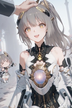 masterpiece,very aware,highres,absurdres,newest,best quality,loli,petite,high quality,chromatic_aberration,cinematic_angle,dutch angle, //,artist:ciloranko,artist:ningen_mame,artist:sho_(sho_lwlw),artist:rhasta,artist:wlop,artist:ke-ta,artist:hiten \(hitenkei\),//,nanami/punishing gray raven,1girl, solo, long hair, bangs,bare shoulders, yellow eyes, ponytail, grey hair, armor, upper body,brown cross shaped pupils,, :d, solo focus, chibi, :3, > <, headpat,