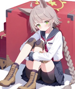 O,ultra detailed anime texture,Otogi(blue archive),Otogi(blue archive),1girl,solo,shorts,black shorts,green eyes,animal ears,skirt,white background,bike shorts,long sleeves,pleated skirt,looking at viewer,brown footwear,boots,grey hair,ahoge,sailor collar,bangs,halo,white shirt,sitting,closed mouth,school uniform,shirt,shorts under skirt,short shorts,serafuku,full body,cross-laced footwear,hugging own legs,simple background,knees up,socks,shadow,long hair,tail,black socks,blush,blue skirt,blue sailor collar,(UHD),accurate,super detail,award winning,high quality,best quality,high details,textured skin,anatomically correct,retina,HD,16k,
