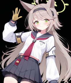 O,ultra detailed anime texture,Otogi(blue archive),Otogi(blue archive),1girl, solo, skirt, animal ears, green eyes, gloves, smile, bike shorts, grey hair, halo, long hair, ahoge, school uniform, pleated skirt, looking at viewer, serafuku, sailor collar, shorts, black background, simple background, hairband, waving, bag, long sleeves, black shorts, wolf ears, red neckerchief, neckerchief, blush, bangs, shirt, black skirt, very long hair, yellow gloves, white shirt, bike shorts under skirt, closed mouth, black sailor collar, cowboy shot,(UHD),accurate,super detail,award winning,high quality,best quality,high details,textured skin,anatomically correct,retina,HD,16k,
