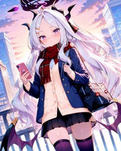 Hina (Blue Archive),O,Hina \(Blue Archive\), 1girl, hina, (blue archive), solo, long hair, horns, scarf, thighhighs, phone, white hair, bag, cellphone, halo, skirt, wings, hair ornament, holding, blush, jacket, purple eyes, school bag, school uniform, low wings, looking at viewer, parted bangs, holding phone, hairclip, demon wings, blue jacket, smartphone, pleated skirt, long sleeves, black thighhighs, bangs, ahoge, demon horns, zettai ryouiki, black skirt, plaid scarf, red scarf, cardigan, charm, (object), multiple horns, dutch angle, sky, plaid, very long hair, railing, outdoors, standing, open clothes, white shirt, miniskirt, cloud, blazer, demon girl, open jacket, shirt, closed mouth, sunset, sidelocks, forehead, fringe trim, buttons, purple thighhighs, building, bag charm, alternate costume, cowboy shot, shoulder bag, cloudy sky, cityscape,(UHD),anatomically correct,accurate,textured skin,super detail,high details,award winning,best quality,high quality,retina,HD,16k,1080P,