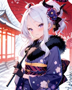 Hina (Blue Archive),O,Hina \(Blue Archive\), 1girl, solo, japanese clothes, oil-paper umbrella, gloves, white hair, kimono, horns, umbrella, flower, purple eyes, obi, hair ornament, looking at viewer, sash, black gloves, hina, (blue archive), halo, holding, ahoge, upper body, smile, holding umbrella, hair flower, bangs, long hair, fur collar, floral print, parted lips, long sleeves, parted bangs, blurry, blush, print kimono, sidelocks, purple kimono, hair between eyes, wide sleeves, ponytail, depth of field, blurry background, official alternate costume, fur trim, demon horns, hair bun, red umbrella, blue kimono, bow, purple flower,(UHD),anatomically correct,accurate,textured skin,super detail,high details,award winning,best quality,high quality,retina,HD,16k,1080P,