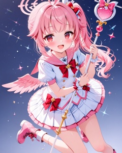 O,Five fingers,natsu (blue_archive),1girl, halo, solo, pink hair, magical girl, red eyes, holding, side ponytail, boots, puffy sleeves, full body, smile, gradient, long hair, gradient background, short sleeves, white background, ahoge, wand, staff, skirt, sailor collar, pink sailor collar, looking at viewer, puffy short sleeves, bow, bangs, white shirt, pleated skirt, shirt, standing, blush, holding wand, cosplay, :d, standing on one leg, white skirt, pink footwear, open mouth, simple background, holding staff,(UHD),anatomically correct,accurate,textured skin,super detail,high details,award winning,best quality,high quality,retina,HD,16k,1080P,