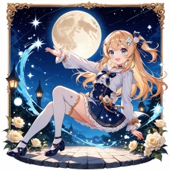 Melting,1girl,blue eyes,moon,thighhighs,looking at viewer,solo,long hair,smile,night,blonde hair,open mouth,white flower,white rose,flower,virtual youtuber,hair ornament,choker,skirt,sky,white thighhighs,full moon,night sky,star (sky),full body,long sleeves,hair bow,bow,:d,(UHD),anatomically correct,accurate,textured skin,super detail,high details,award winning,best quality,high quality,retina,16k,HD,1080P,8k,