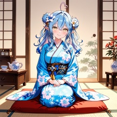 Melting,1girl, yukihana lamy, heart ahoge, virtual youtuber, blue hair, solo, pointy ears, japanese clothes, kimono, long hair, heart, seiza, yellow eyes, smile, ahoge, multicolored hair, looking at viewer, blue kimono, sitting, hair bun, streaked hair, sash, bangs, hair ornament, cup, breasts, obi, blush, double bun, elf, tea, closed mouth, floral print, flower, teacup, hair flower, large breasts, hair between eyes, teapot, wide sleeves, long sleeves, print kimono, full body,(UHD),anatomically correct,accurate,textured skin,super detail,high details,award winning,best quality,high quality,retina,16k,HD,1080P,8k,