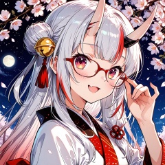 Melting,1girl, nakiri ayame, virtual youtuber, horns, oni horns, solo, glasses, multicolored hair, double bun, japanese clothes, red eyes, hair ornament, red hair, long hair, hair bun, streaked hair, bell, looking at viewer, hair bell, kimono, smile, night, white hair, fang, oni, open mouth, blush, upper body, sky, outdoors, bangs, white kimono, star (sky), adjusting eyewear, hair ribbon, jingle bell, ribbon, :d, night sky,(UHD),anatomically correct,accurate,textured skin,super detail,high details,award winning,best quality,high quality,retina,16k,HD,1080P,8k,