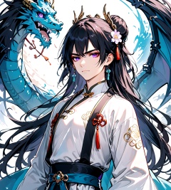 1boy,purple eyes,long hair,dragon,black hair,male focus,holding,weapon,looking at viewer,long sleeves,chinese clothes,solo,holding weapon,eastern dragon,hanfu,wide sleeves,upper body,closed mouth,sash,sword,floating hair,hair ornament,serious,hair bun,