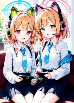 multiple girls,2girls,momoi (blue archive),midori (blue archive),blonde hair,tongue,green eyes,tongue out,animal ears,animal ear headphones,headphones,necktie,cat ear headphones,twins,halo,fake animal ears,siblings,sisters,bow,shirt,blue necktie,hair bow,jacket,blush,:p,short hair,nintendo switch,school uniform,white shirt,playing games,pink eyes,sitting,collared shirt,red eyes,couch,red bow,holding,