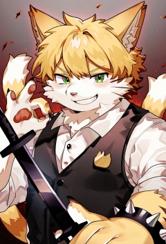 1boy, KUROTERO style, ok sign, furry male, upper body, furrification, sword, green eyes, jewelry, claws, black vest, spiked bracelet, furry, v-shaped eyebrows, weapon, two tails, grin, holding sword, vest, smile, cat boy, spikes, animal ears, collared shirt, multiple tails, holding, short hair, tail, solo, cat ears, furry female, looking at viewer, holding weapon, animal ear fluff, shirt, blonde hair, white shirt, bracelet,masterpiece, best quality <lora:KUROTERO style(noob):1>