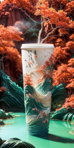 (Masterpiece, high quality, best quality, official art, beauty and aesthetics: 1.2), milk tea cup, surrounded by red rocks, splashing spray, (Chinese landscape paper carving, Chinese Song Dynasty landscape painting: 1.2), (surrealist dream style), cream organic fluid, light tracing, environmental shielding, hazy, natural light, limestone, gel resin sheet, oc rendering, (peach blossom forest background: 1),