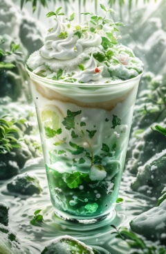 green,(Masterpiece, Boutique, Boutique, Official Art, Beauty, Aesthetics):1.2),a glass of ice and snow surrounded,milky white transparent water,Clean light color background,ray tracing,foreground occlusion,natural light,C4D,OC rendering,product photography,