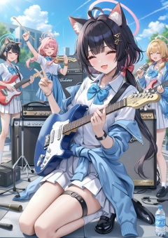 Noyu,Torino,jw,0,instrument, multiple girls, 5girls, halo, animal ears, pink hair, guitar, long hair, jacket, black hair, skirt, v, shirt, blonde hair, double v, water bottle, closed eyes, smile, short hair, electric guitar, twintails, clothes around waist, shoes, white skirt, bottle, sky, pleated skirt, white shirt, hair bow, standing, ahoge, kneeling, drum, cat ears, school uniform, keyboard (instrument), bow, socks, outdoors, holding instrument, cloud, blue sky, hair ornament, music, drumsticks, thigh strap, playing instrument, open mouth, sitting, black footwear, day, low twintails, holding, blue jacket,(UHD),anatomically correct,ccurate,textured skin,super detail,high details,award winning,best quality,high quality,retina,16k,HD,1080P,8k,