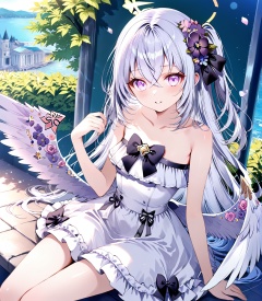 azusa (blue archive),Noyu,Torino,jw,0,1girl, flower, solo, dress, long hair, wings, hair ornament, azusa (blue archive), hair flower, looking at viewer, halo, sitting, smile, white dress, bare shoulders, purple flower, strapless, white hair, bangs, hair between eyes, outdoors, very long hair, strapless dress, purple eyes, crossed bangs, breasts, bow, small breasts, collarbone, parted lips, white wings, day, ribbon,(UHD),anatomically correct,ccurate,textured skin,super detail,high details,award winning,best quality,high quality,retina,16k,HD,1080P,8k,