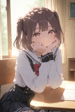 1girl,smile,two side up,school uniform,white shirt,long sleeves,pleated skirt,black skirt,white sailor collar,double-breasted,red bowtie,white serafuku,black trim,suspender skirt,frilled skirt,black frills,black buttons,diamond cutout,white sleeve cuffs BREAK rim light,Volumetric Lighting,Cinematic Lighting,lens flare,light leaks,background light,available light,moody lighting,blurry,illustration,artbook,game cg,wallpaper,depth of field,dim,bloom,sunlight,dappled sunlight BREAK 1girl,solo,looking at viewer,sitting,on chair,desk,indoors,window,curtains,day,depth of field,lens_flare,backlighting,front view,head rest,arm on table,