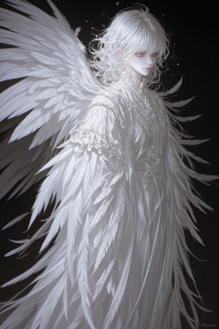 ZOZ_WEIMEIW,This is a digital painting of a tall,ethereal figure with flowing,white,feathered wings and intricate,ornate robes. The figure has pale skin,curly white hair,and a serene expression. The background is dark,emphasizing the luminous,textured details of the robes and wings. The style is highly detailed and fantastical,reminiscent of gothic or fantasy art.,