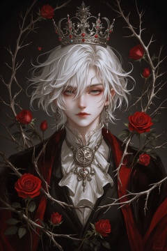 ZOZ_WEIMEIW,A digital painting of a pale-skinned,androgynous figure with short,wavy platinum blonde hair,adorned with a crown and intricate jewelry. They wear a black and red velvet cloak with a white lace collar. Thorns and red roses frame the subject,creating a gothic,ethereal atmosphere. The style is detailed and dark fantasy.,
