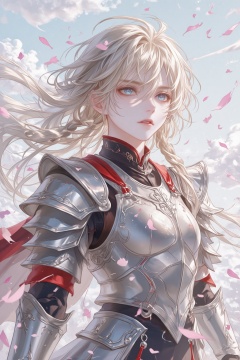 ZOZ_WEIMEIW,ZOZ_DMAM,a digital illustration,a digital illustration shoot from a portrait camera angle about a young woman with long,flowing blonde hair and blue eyes,dressed in silver armor,surrounded by pink petals falling in the air against a clear blue sky with fluffy white clouds,in the middle of the image,a 1woman,who appears to be in her early twenties,with a serious expression,is facing the viewer with her blue eyes looking directly at the viewer,she has a slender physique,fair skin,and long blonde hair styled in a braid,her hair falls down her back,and she is wearing silver armor with red accents,including shoulder armor and a red cape,the armor is detailed and shiny,with intricate designs on the shoulders and collar,the background is a soft,pastel sky with scattered pink flower petals,giving the image a dreamy,ethereal quality,