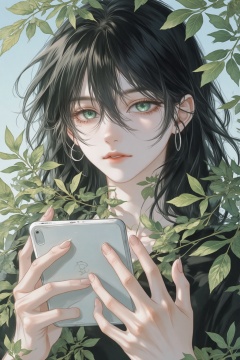 ZOZ_WEIMEIW,ZOZ_DMAM,a digital illustration,a digital illustration shoot from a close-up camera angle about a young woman with long black hair and green eyes holding a white tablet,surrounded by green leaves,the image also shows soft lighting and a serene atmosphere,on the middle of the image,a 20 years old woman appears to be looking at the viewer with a neutral expression,she has a slender physique and fair skin,her hair is styled in long hair and falls between her eyes,she is wearing no clothing or accessories,her green eyes are looking directly at the camera,her lips are parted and she is holding the tablet in her hands,the background is a clear blue sky with some green leaves scattered around,