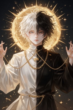 ZOZ_WEIMEIW,A digital painting of a young,androgynous figure with short,curly hair,half-white and half-black,standing against a radiant golden halo. The figure wears a flowing white robe on the left and a black robe on the right,adorned with gold chains. The background is dark with golden sparkles,creating a celestial,angelic atmosphere.,