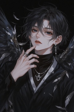 ZOZ_WEIMEIW,sfw,1boy,male focus,solo,wings,dark,feathers,dark hair,black background,jewelry,closed eyes,short hair,original,earrings,lying,looking at viewer,lying on side,hand to own mouth,black eyes,feathers on wings,upper body,feathered wings,from above,male focus,long sleeves,lying on back,sparkle,upper teeth,parted lips,teeth,photoshop (medium),