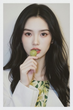 ZOZ_PLD,a photo-realistic portrait of a young woman with long,wavy black hair,holding a small,green fruit in her mouth,she is positioned in the middle of the frame,looking directly at the viewer with a neutral expression,her eyes are a striking brown color,and her lips are slightly parted,revealing a hint of her teeth,she has a slim body and is wearing a white blouse with a floral pattern,the background is a plain,light-colored wall,and the image has a soft,ethereal quality to it,the woman is holding the fruit with one hand and her fingers are delicately placed near her mouth,as if savoring the moment,the image is framed with a white border,giving it a clean and professional look,