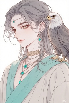 ZOZ_SUMIAOHH,ZOZ_SUMIAOMIAO,a digital illustration shoot from a profile camera angle about a portrait of a woman with a bird perched on her shoulder,adorned with jewelry,the image also shows a serene and elegant atmosphere,on the middle of the image,a 1woman,who appears to be in her early twenties,with light skin and long,wavy gray hair,is facing the viewer with a calm expression,she is wearing a white robe with a turquoise shawl draped over her shoulders,and adorned with multiple necklaces and earrings,including a necklace with emeralds and diamonds,her eyes are brown and looking to the side,and she has a subtle smile on her lips,on her right shoulder,a bald eagle with white and grey feathers is perched,looking directly at the viewer,the background is a plain white,and the artists signature is visible in the bottom right corner,