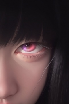 ZOZ_HEHUHU,ZOZ_YM,The image depicts a close-up of a character with long black hair and a prominent pink and purple eye. The characters eye on the left is red with a white heart symbol in the center,while the eye on the right is purple. The background is dark,with a subtle glow around the characters face,emphasizing the contrast between the two eyes. The overall atmosphere is moody and mysterious,with a focus on the characters expressive gaze.,
