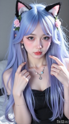 A close-up shot of a girl with long, blue-pink hair adorned with a hair ornament and a flower. She is wearing a black dress and holds cat ears, complemented by earrings and a necklace. The lighting is soft and natural, highlighting her upper body and the intricate details of her attire and accessories. The composition focuses on her face and hands, capturing an enchanting and playful expression.