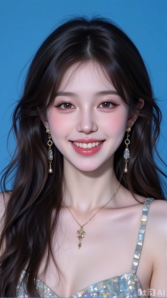 A solo girl with long, black hair and a smile, looking directly at the viewer with brown eyes and wearing a dress. She has jewelry, including earrings and a necklace, with her teeth showing in a grin. The scene is set against a blue background, creating a realistic image.