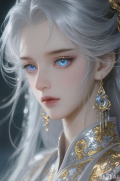This image showcases a female character with long silver hair. Her eyes are large and bright, with blue pupils that convey an air of mystery and elegance. She wears a pair of exquisite earrings featuring intricate designs and a metallic sheen, which perfectly complement her overall appearance.