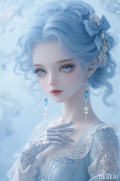 This image showcases a virtual character dressed in elegant attire. Her hair is a soft blue shade, curly and fluffy, adorned with a delicate blue bow and pearl accessories. She wears long blue earrings inlaid with sparkling blue gemstones. Her eyes are large and bright, framed by thick lashes, exuding a mysterious and dreamy aura.