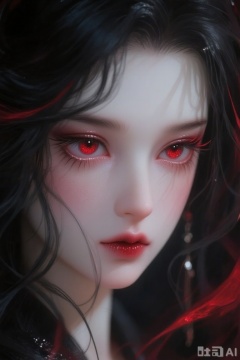 This image portrays a female character of exquisite beauty, featuring delicate facial traits including large, expressive eyes with striking red irises that harmonize with her overall makeup. Her slender eyebrows and precisely defined eyeliner contour the eyes, enhancing their depth. Her lips are adorned with vivid red lipstick, mirroring her eye color and creating a cohesive aesthetic.