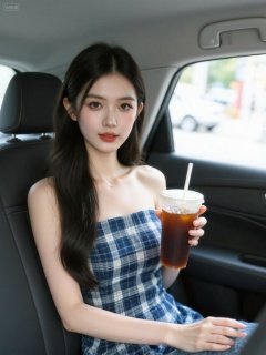 photograph of an east asian woman with long, straight black hair and fair skin, sitting in the drivers seat of a car, she wears a blue and white plaid strapless dress and holds a large iced coffee with a white straw in her right hand, she has a small nose ring in her left nostril and light makeup with red lipstick, the car interior is dark gray, with a visible window showing a bright, blurred outdoor scene, her expression is neutral, and she is slightly leaning back with her left arm resting on the door, the image has a soft, natural light, Steps: 28, Sampler: Euler, CFG scale: 4.0, Seed: 1121114249, Size: 768x1024, Model hash: 0734f0ab2ac6ee5eb9b9dd78fe8bae3a6ef8278135a482073ae31c17ea238747, Model: flux1-dev.sft, Denoising strength: 0, RNG: CPU, Lora 1: 20.safetensors, Lora Hash 1: 7622b1b523f93ebdd915a0d56777a54b18a61a8a2971b053e8459775a39910e2, Lora Weight 1: 0.8, vae_name: automatic