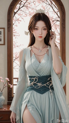 1woman, solo, ornament, SY clothes, breasts, no eye shadow, hair_tucking, cowboy_shot, even lighting,  wind blows through hair, looking at viewer, very awa, Pink Petals Scattered and Solid mirror face background,