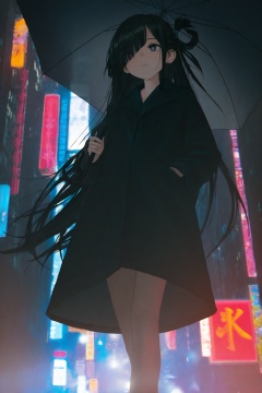 highres,absurdres,very awa,masterpiece,best quality,newest,year 2024,mocha \(cotton\),rella,(banishment:1.1),(fkey:0.6),(bm tol:0.5),(tianliang duohe fangdongye:0.8),(yomu \(sgt epper\):0.7),(kokaki mumose:0.8),(loundraw:0.8),krenz,wlop,konya karasue,(rei \(sanbonzakura\):0.5),chiaroscuro,mood lighting,(3d:1.3),dramatic shadows,cinematic lighting,volumetric lighting,atmospheric lighting,subsurface scattering,dreamy atmosphere,ethereal glow,ray tracing,film grain,chromatic aberration,close up,movie perspective,dynamic pose,1girl,solo,photo background,black theme,1girl,solo,loli,black hair,very long hair,long hair,asymmetric bangs,blunt bangs,diagonal bangs,hair over one eye,eyes visible through hair,single hair intake,single sidelock,single hair ring,red eyes,gradient eyes,purple eyes,white pupils,evening gown,coat,mysterious,thoughtful,walking,holding umbrella,city street,neon lights,black sky,moonlight,cinematic shadows,low angle shot,silhouette,from below,
